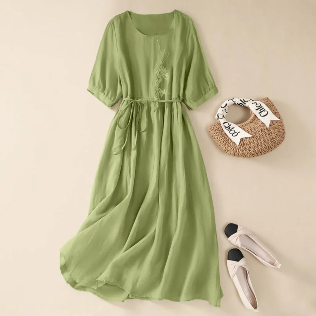 - Belted waist linen dress: Defines the waist and creates a tailored silhouette, adding a touch of formal polish to otherwise relaxed linen designs.